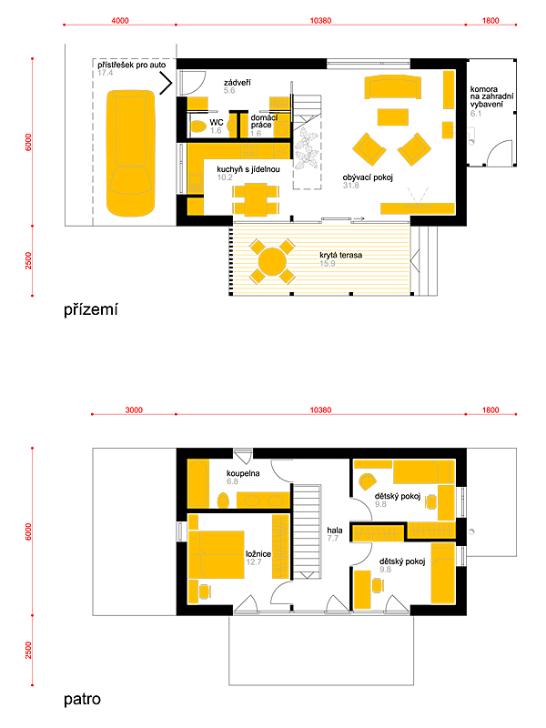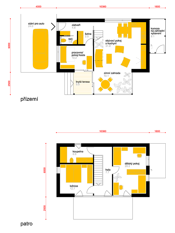 V patře je hala, z níž jsou přístupné dva dětské pokoje, ložnice a prostorná koupelna s oknem, vanou, WC a dvěma umývadly.